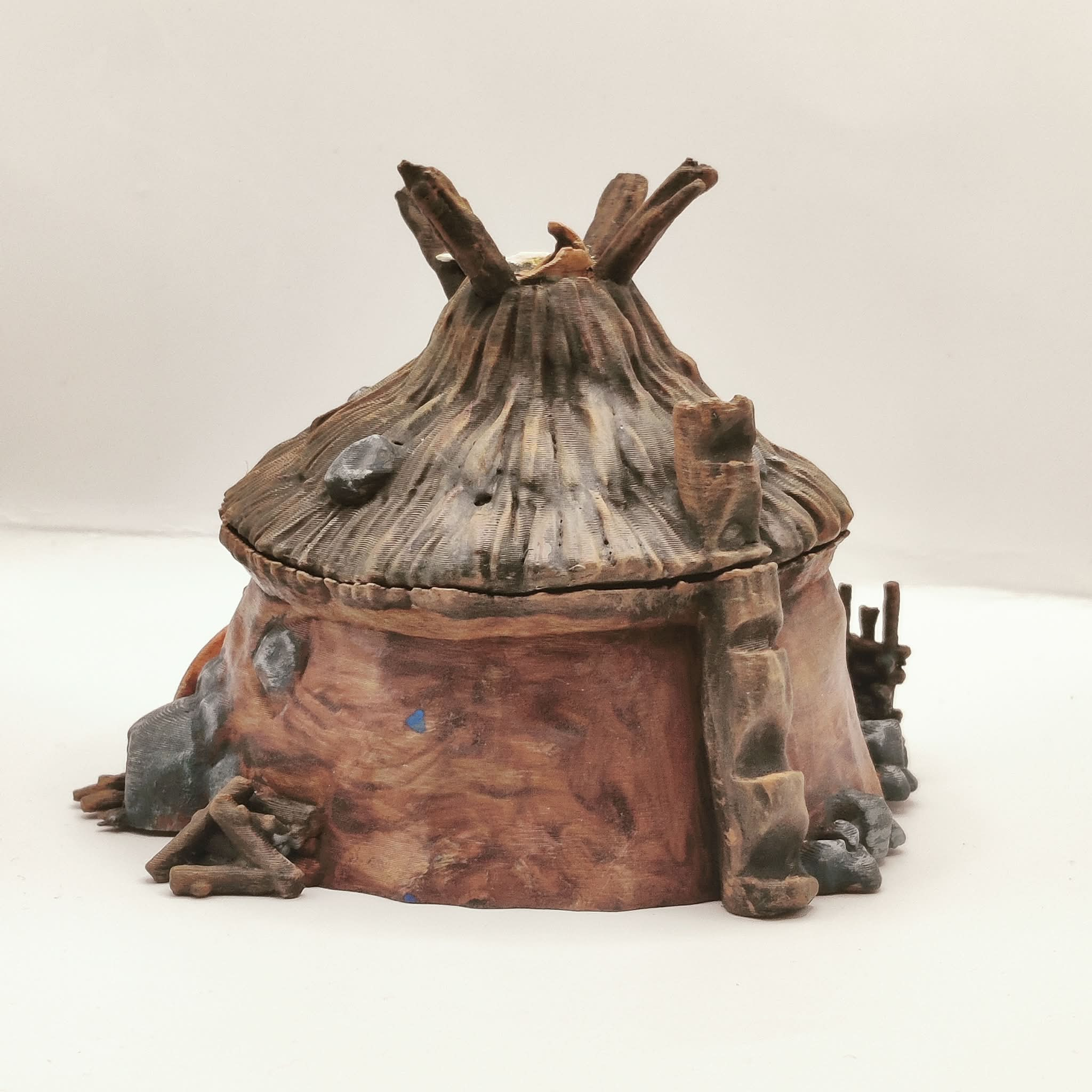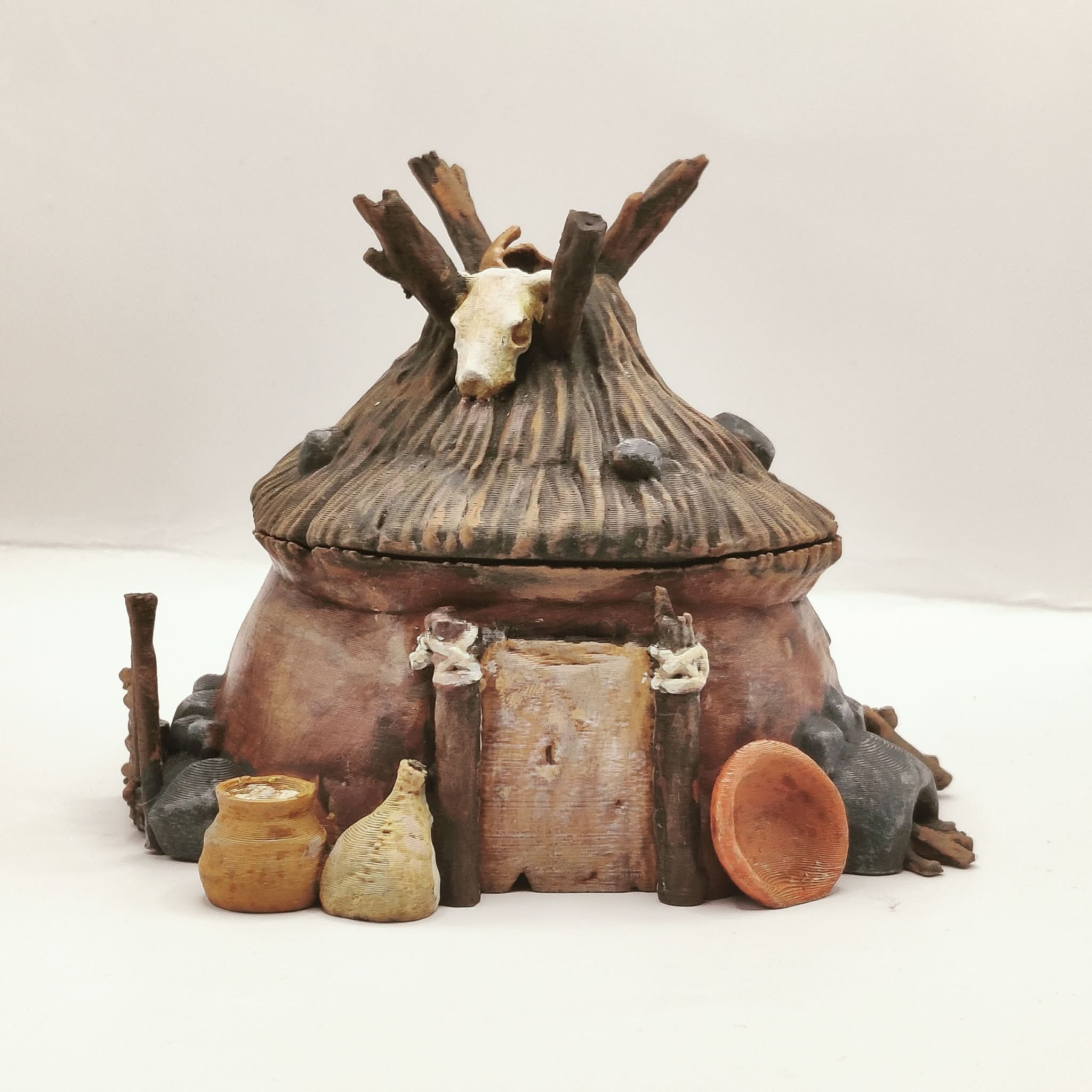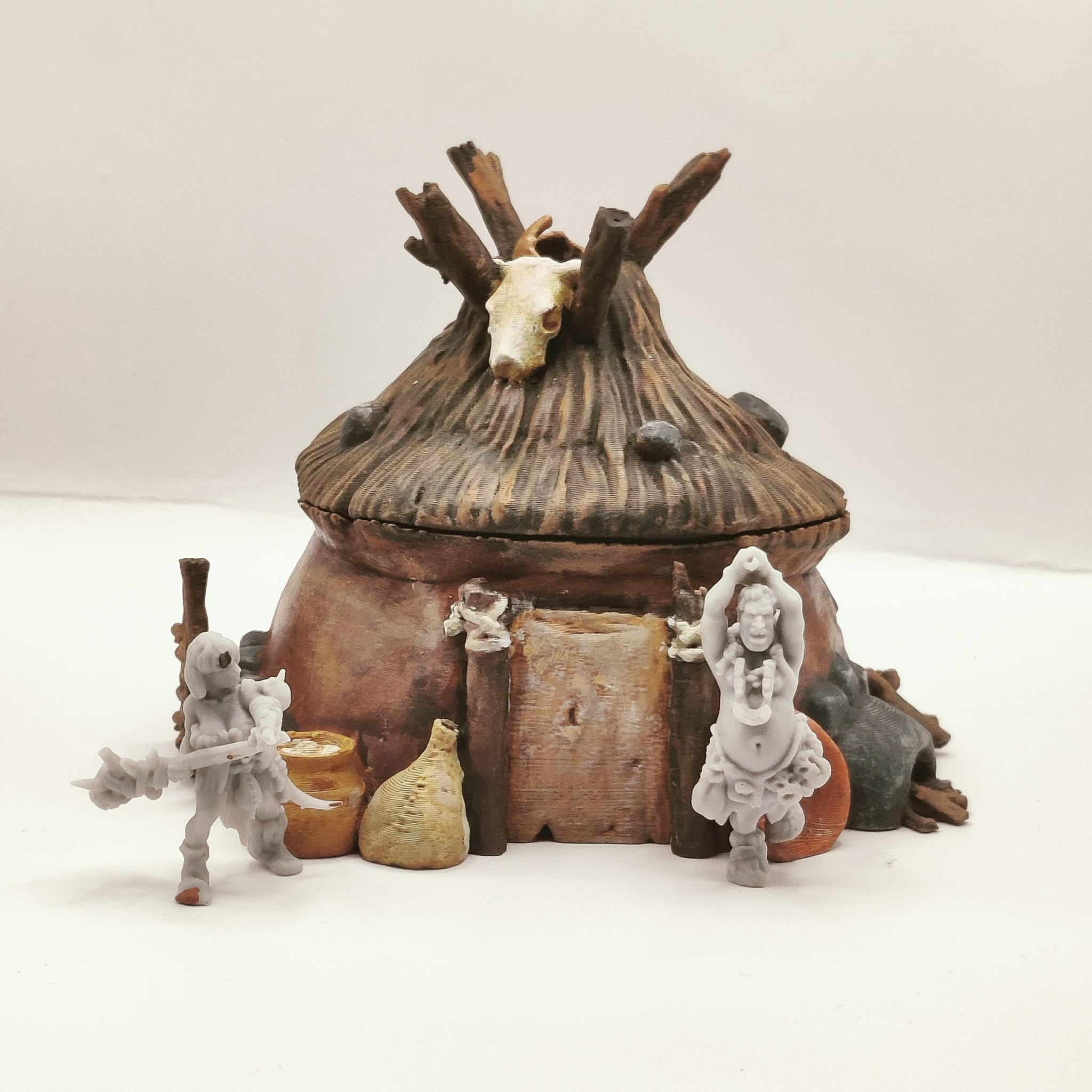 A round hut intended for use as a terrain piece or scatter element in tabletop role-playing and skirmish games. Suitable for prehistoric settlements, tribal villages, and wilderness encampments.