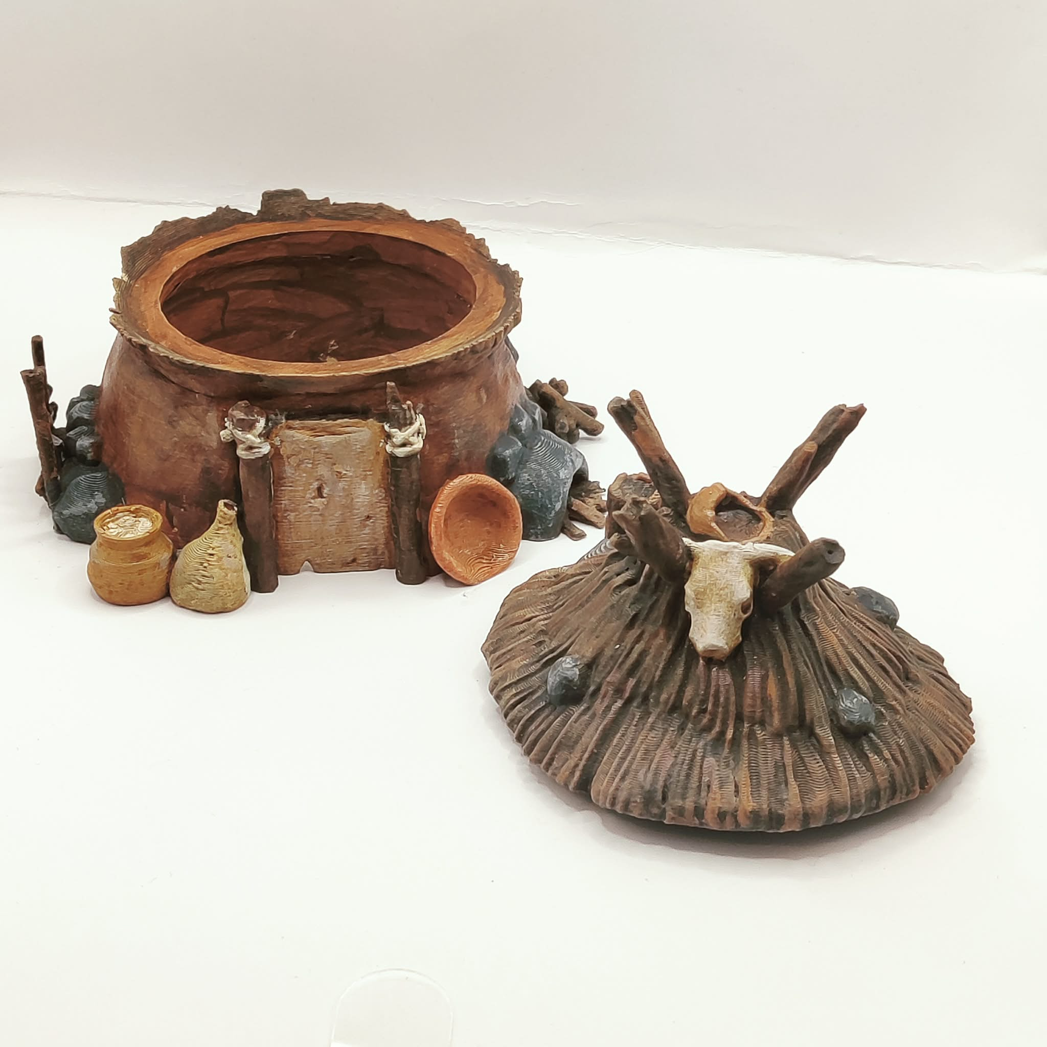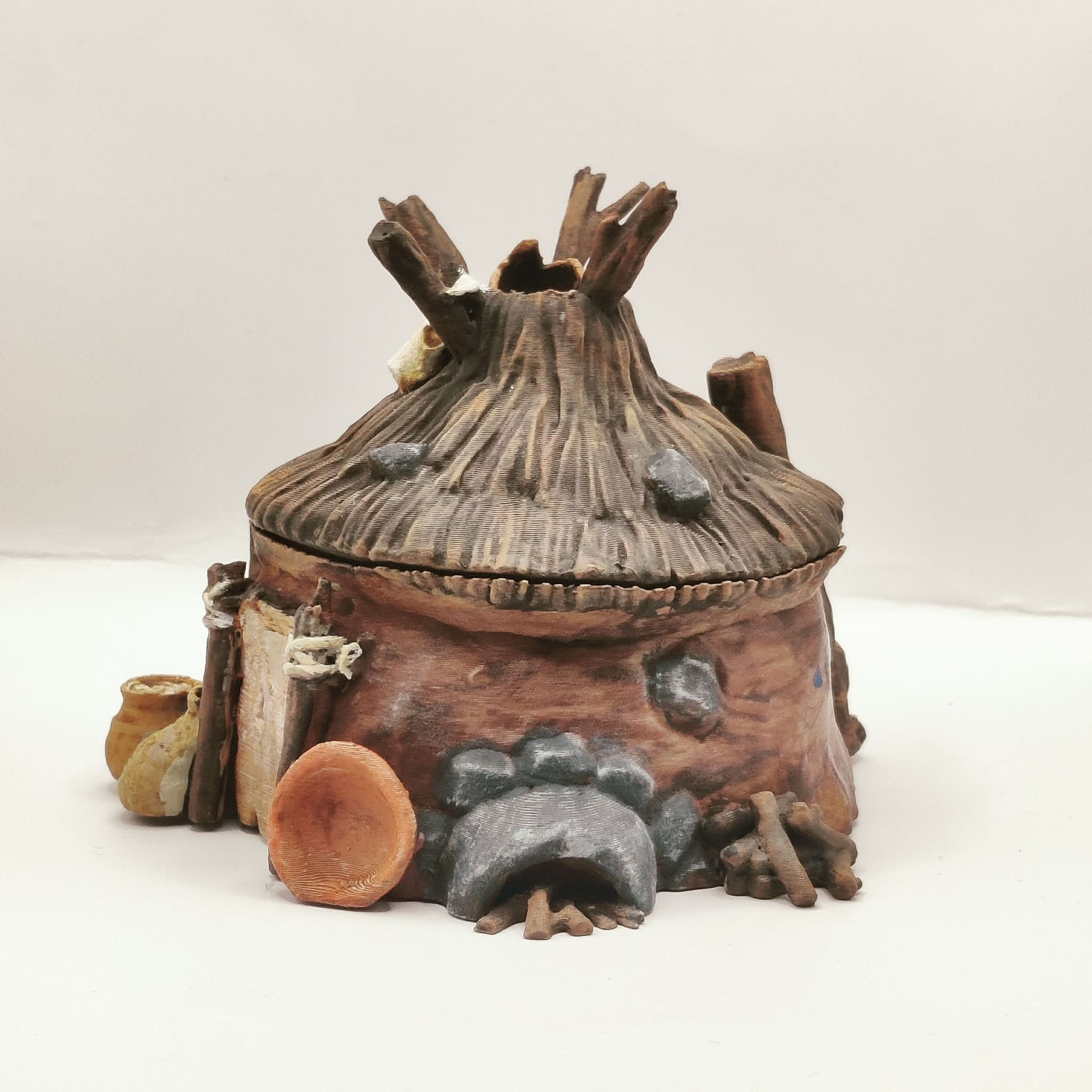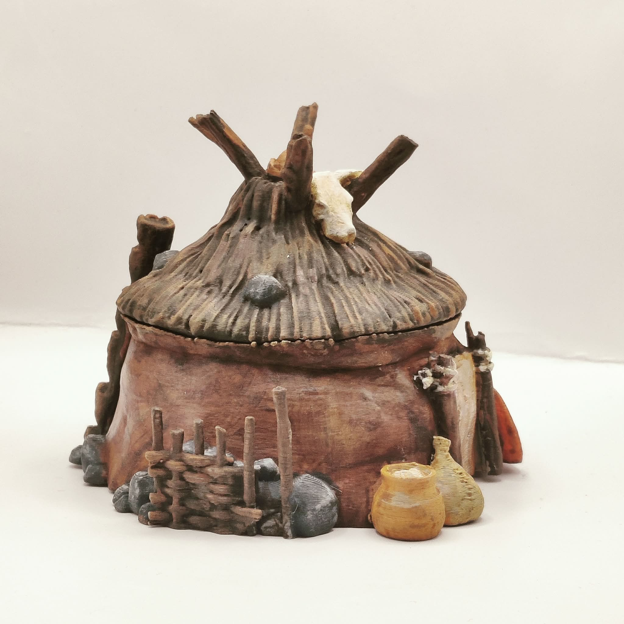 A round hut intended for use as a terrain piece or scatter element in tabletop role-playing and skirmish games. Suitable for prehistoric settlements, tribal villages, and wilderness encampments.